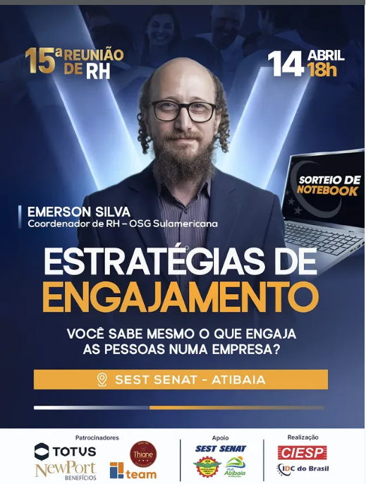 Emerson Silva, coordenador de RH da OSG Sulamericana, compartilha vivências e metodologias comprovadas para engajar times. “Engajamento é o combustível que move as pessoas“, destaca o anúncio do evento, enfatizando abordagens reais contra fórmulas genéricas.
