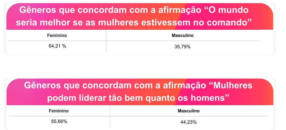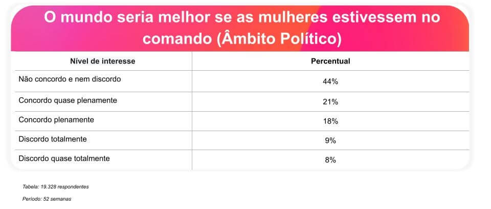 No entanto, quando a pergunta se torna mais subjetiva e hipotética — “O mundo seria melhor se as mulheres estivessem no comando?” —, o cenário se mostra mais dividido. Dos 19.328 respondentes, 39,13% manifestaram concordância com a ideia. A percepção positiva, contudo, também encontra respaldo no público masculino, que representa mais de um terço (35,79%) dos que acreditam nesse potencial de melhoria.