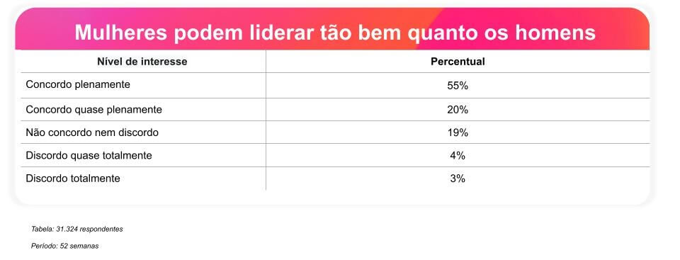A concordância mais expressiva foi registrada na questão sobre a capacidade de liderança. Questionados se “mulheres podem liderar tão bem quanto os homens”, 74,35% dos 31.324 entrevistados concordaram com a afirmação. Deste total, 54,55% disseram concordar plenamente, e outros 19,80% concordam quase totalmente, indicando uma forte aceitação da equivalência de competências. Notavelmente, quase metade (44,23%) dos que endossam essa visão são homens, reforçando que o reconhecimento da capacidade feminina transcende recortes de gênero. Apenas 7,11% discordaram da premissa.