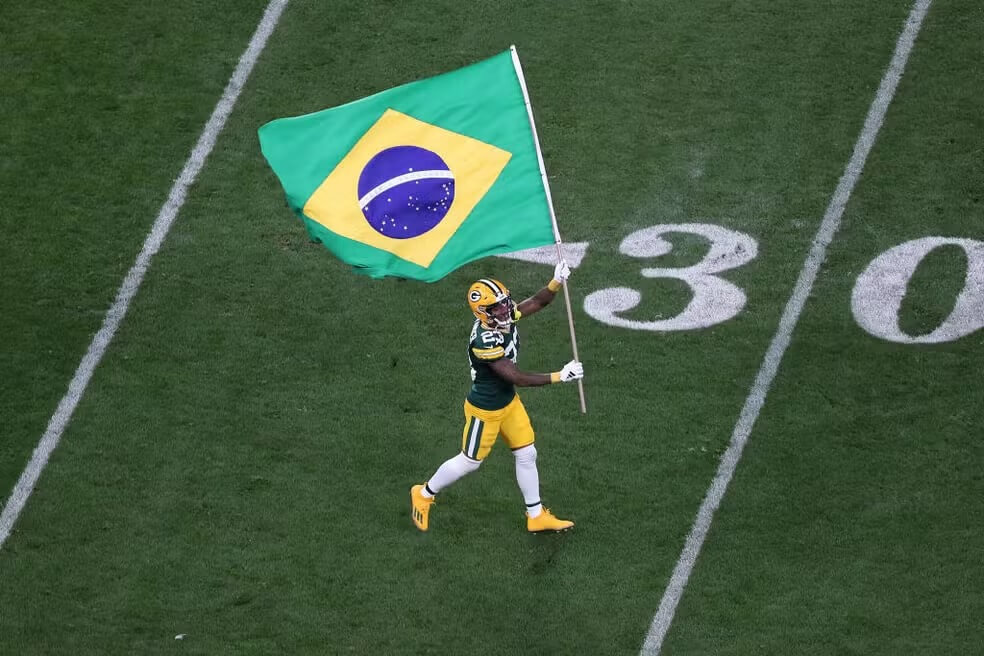 Crédito: NFL Brasil – Jaire Alexander, dos Packers, entra em campo com a bandeira do Brasil — Foto: Wagner Meier/Getty Images